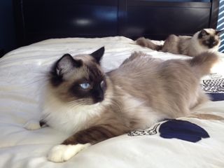 "We picked up our first Temple Doll, Elspeth, in late August, 2012. She was 12 weeks old, healthy, beautiful, loving and spirited. Elspeth was comfortable and friendly with everyone; neighbors, friends, family, most importantly our 1 year old granddaughter. We quickly decided we didn't just want one of these loving, playful and beautiful cats, so we contacted Janet and to our good fortune Elspeth's litter mate, Merlin, joined us. He has all of the qualities of his sister and our granddaughter adores him as well. They have grown into beautiful cats and are wonderful companions who love to be in our company. Anyone who brings one of Janet's kittens to their "forever home" will be lucky indeed!"